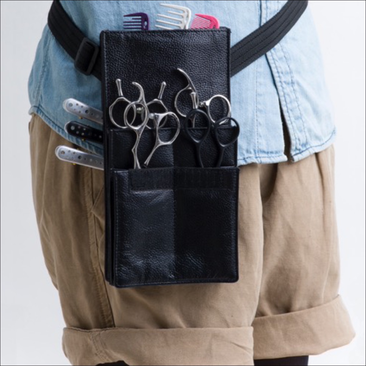 Popular padded leather pouch with cover and adjustable 1 size-fits-all belt to be worn around the waist or shoulder. The secure cover protects your tools while travelling but can be folded back while you work. Securely holds up to 6 scissors and also has 1 large comb pocket.